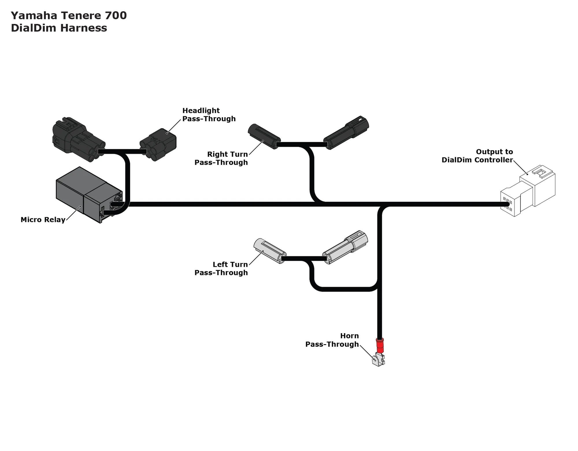 This wiring adapter enables plug-&-play connection between our standard DialDim Lighting Controller and the Yamaha Tenere 700. To install, simply connect the white connector to our DialDim Controller and the remaining connectors in line at the Tenere 700 headlight, horn, and turn signal connectors.