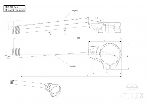 Gilles Tooling 55mm Race Clip On Set The German company Gilles Tooling has been providing high-quality, innovative accessories for road-racing and street riding use since 2000. The company founder Gerhard Gilles, has combined his love of the sport, experience as a former racer and his technical knowledge of master CNC milling and design to create innovative solutions for performance parts. Gilles Tooling not only supplies to a worldwide market, but is also a trusted supplier of genuine accessories for Yamaha, Suzuki and BMW. Gilles Tooling is a development partner of Yamaha Racing Special Parts, showcased on all factory supported M1 Moto GP bies and R1M superbikes. Developed on the racetrack but also extensively tested on the road, Gilles Tooling products set standards in innovation, engineering know-how, performance and safety and comply to all European certifications. FEATURES: Aluminum Black Anodized 55mm Diameter: 7/8″ | 22mm Rise: 15/16″ | 23mm Length: 12-1/8″ | 30.8cm Weight: 2.35lbs Very lightweight construction Separate bolting for clamp and tube to avoid damages to the fork in case of crash Tube bolted at the outer position for easier change with standard tools Fixed angle of 6° is the perfect compromise for sport and street uses NOTE: +23 mm for comfortable position. Original clamps for top yoke (left and right) must be purchased separately for use with BMW models. Please note this is a universal part – please confirm cip on diameter for your motorcycle prior to ordering.