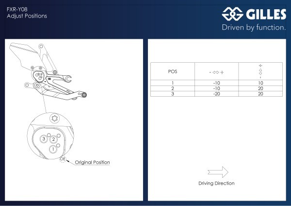 Gilles Tooling FXR Rearsets Yamaha R7 (2021-2023) The German company Gilles Tooling has been providing high-quality, innovative accessories for road-racing and street riding use since 2000. The company founder Gerhard Gilles, has combined his love of the sport, experience as a former racer and his technical knowledge of master CNC milling and design to create innovative solutions for performance parts. Gilles Tooling not only supplies to a worldwide market, but is also a trusted supplier of genuine accessories for Yamaha, Suzuki and BMW. Gilles Tooling is a development partner of Yamaha Racing Special Parts, showcased on all factory supported M1 Moto GP bies and R1M superbikes. Developed on the racetrack but also extensively tested on the road, Gilles Tooling products set standards in innovation, engineering know-how, performance and safety and comply to all European certifications. FEATURES: Maximum performance and minimum weight Black Standard + Reverse shifting possible Sporty and aesthetic design Perfect balance of lightweight construction and torsional rigidity Double ball bearing shift and brake levers 3-way adjustable rigid racing peg