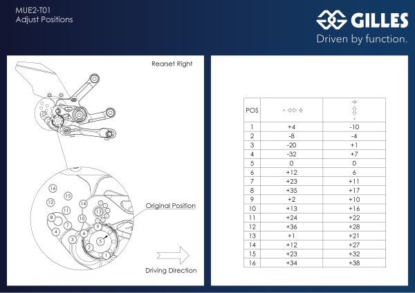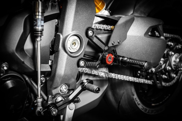 Gilles Tooling MUE2 Rearsets T riumph Speed Triple 1200 RR / RS (2022) The German company Gilles Tooling has been providing high-quality, innovative accessories for road-racing and street riding use since 2000. The company founder Gerhard Gilles, has combined his love of the sport, experience as a former racer and his technical knowledge of master CNC milling and design to create innovative solutions for performance parts. Gilles Tooling not only supplies to a worldwide market, but is also a trusted supplier of genuine accessories for Yamaha, Suzuki and BMW. Gilles Tooling is a development partner of Yamaha Racing Special Parts, showcased on all factory supported M1 Moto GP bies and R1M superbikes. Developed on the racetrack but also extensively tested on the road, Gilles Tooling products set standards in innovation, engineering know-how, performance and safety and comply to all European certifications. A completely new generation of rearsets The MUE2 combines futuristic design with the highest quality and simplified adjustability of the footrest. Either black or gold anodized with contrast adjusters it is also an optical highlight on every bike.The position of the footrests as well as the brake and gear levers can be adjusted according to personal needs. The positioning of the footrests is done by a combination of a push and rotatable setting at only one point, so this is really fast and easy selectable (five positions through pushing and four positions by rotating). Brake and shift levers come with double ball bearings for perfect free of play function of the levers. Aluminum heel guards on both sides complete the scope of delivery. FEATURES: Aluminum Anodized Black/Red 16 adjustment positions Standard shifting only Combines futuristic design with the highest quality and simplified adjustability of the footrest Contrast adjusters are an optical highlight on every bike The position of the foldable footpegs as well as the brake and gear levers can be adjusted according to personal needs The positioning of the footrests is done by a combination of a push and rotatable setting at only one point, so this is really fast and easy selectable Brake and shift levers come with double ball bearings for perfect free of play function of the levers Aluminum Heel guards on both sides Foldable footpegs