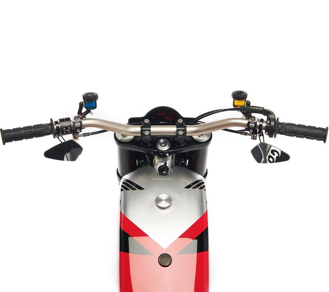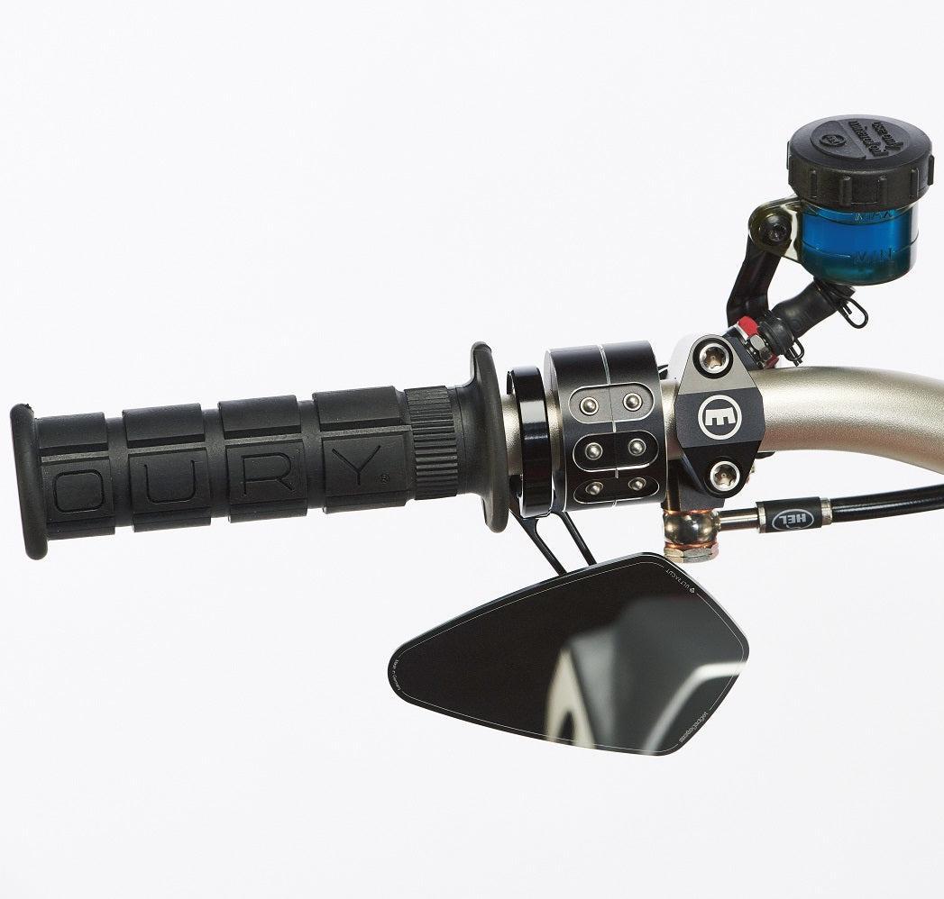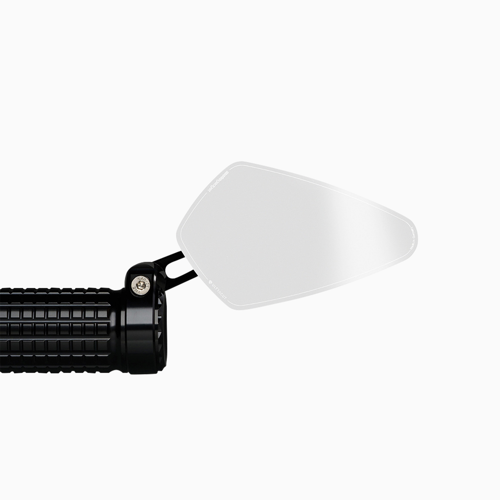 The handlebar end mirror with swivel mirror arm and defined locking angles is perfect for narrow passages or when there are space problems in the garage. The mirror can be mounted above or below the handlebars and is not ECE marked. This mirror is not approved for use on public roads within the EU.